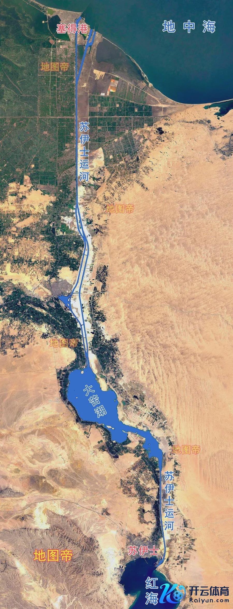 苏伊士运河在沙漠中穿行,南北长约163千米,除东说念主工开凿的水说念外,还包括3个自然咸水湖:大苦湖、小苦湖、提姆萨湖。航说念穿过苏伊士运河比绕说念好望角,可裁减7000千米航程。
