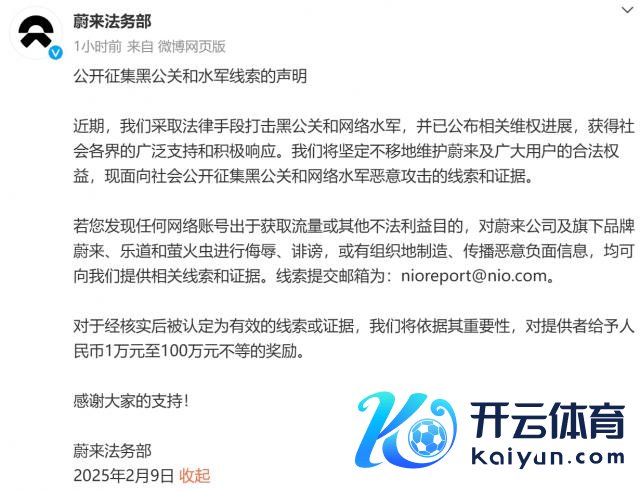 蔚来法务部 2 月 9 日发布《公开搜集黑公关和水军印迹的声明》。
