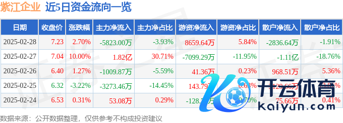 本站音讯云开体育,末端2025年2月28日收盘,紫江企业(600210)报收于7.23元,高涨2.7%,换手率13.44%,成交量203.92万手,成交额14.83亿元。