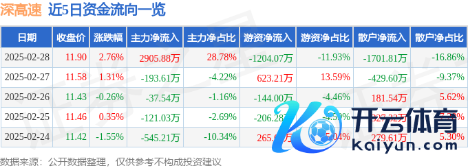 本站音讯,放胆2025年2月28日收盘开云官网切尔西赞助商,深高速(600548)报收于11.9元,高潮2.76%,换手率0.6%,成交量8.54万手,成交额1.01亿元。