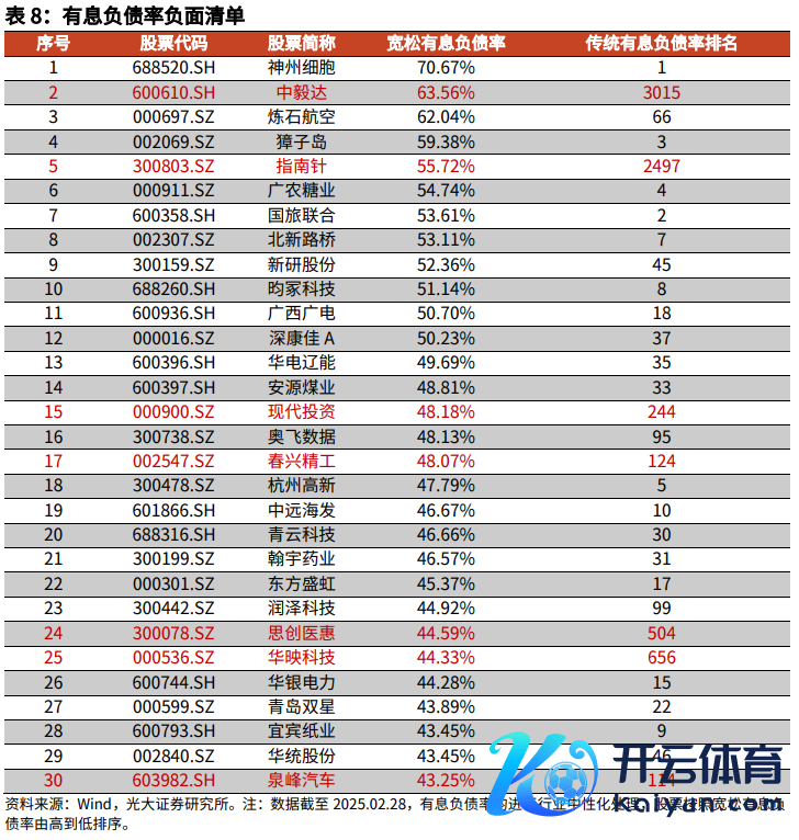 为止2025年2月28日,宽松有息欠债率名次前30的股票统计如下。其中中毅达、指南针、当代投资、春兴精工、想创医惠、华映科技、泉峰汽车在传统口径下名次在100及以后。