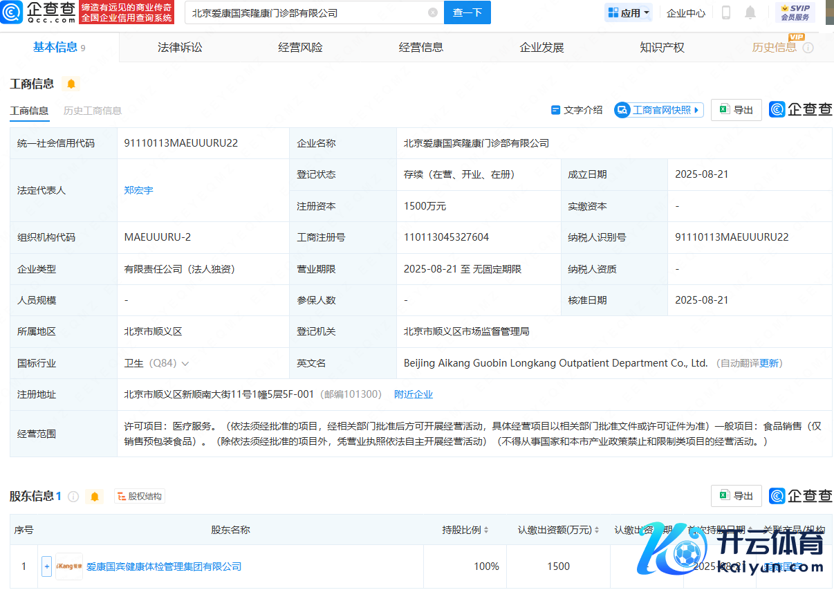 企查查APP披露,近日,北京爱康国宾隆康门诊部有限公司树立,法定代表东谈主为郑宏宇,注册成本为1500万元,运筹帷幄畛域包含:医疗劳动;食物销售(仅销售预包装食物)。企查查股权穿透披露,该公司由爱康国宾健康体检处分集团有限公司全资握股。