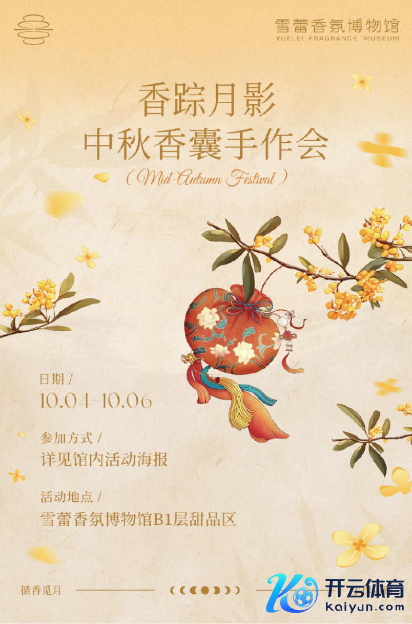 以中秋月圆、桂花飘香为灵感,卓越推出“香踪月影”香囊手作会,让不雅众亲手缝制一枚寓意团圆与祝贺的香囊,在千里浸式氛围中感受香氛与传统节俗的交融。限额有限,先到先得,东谈主满即止。