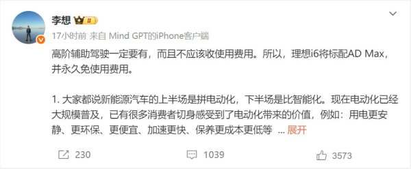 9月24日开云体育,理思汽车(HK02015,股价:99.000港元;总市值:1998亿港元)CEO李思通过酬酢媒体发表不雅点,明确暗意“高阶援手驾驶一定要有,况兼不应该收使用用度”。 基于这一理念,行将于9月26日上市的全新五座纯电SUV理思i6将全系标配其高阶援手驾驶系统AD Max,并应允持久奉命使用费。 李思以为,新动力汽车竞争已进入以智能化为枢纽的下半场,而高阶援手驾驶是现阶段智能化的中枢价值点。他指出,面前行业中存在的高阶援手驾驶功能收费模式,且价钱高尚,在一定经过上死心了用户对智